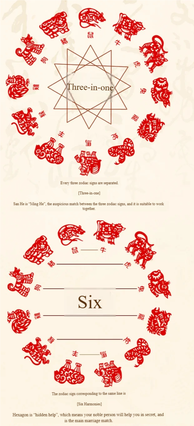 Liuhe refers to the combination of two auspicious people from different zodiac signs, which is a form of covert assistance and support. For example, the combination of Rat and Ox forms a group of benefactors who can help and support each other in secret.